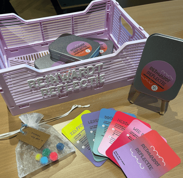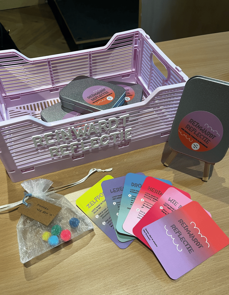 Vorig schooljaar (2023-2024) was mijn laatste jaar aan de Reinwardt Academie. De afsluitende opdracht was: Maak een product dat jou omschrijft als erfgoedprofessional. En zo ontstond de Reinwardt Reflectie. Na mijn opleiding wist ik namelijk zeker: ik wil de verbindende factor zijn tussen kunst/erfgoed en publiek. Ik wilde dan ook een product maken dat dat symboliseert. De Reinwardt Reflectie verbindt leerlingen, docenten en medewerkers door elkaar op een andere manier te leren kennen. En wie weet elkaar te inspireren.