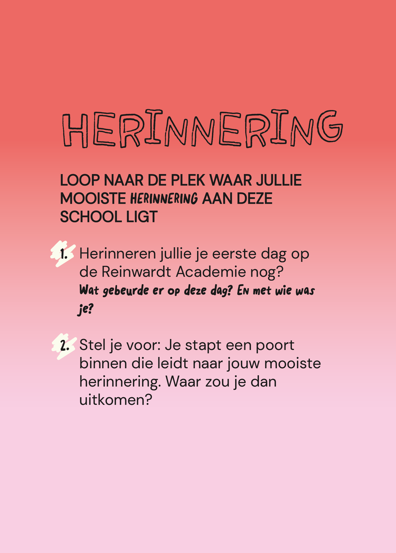 Samen met 2 tot 5 leerlingen, docenten of medewerkers van de Reinwardt ga je op pad in de academie. Loop naar de plek waar jouw favoriete herinnering aan de school ligt of waar je het meeste hebt geleerd. Op deze manier beantwoordt je samen de vragen op de plek die waardevol is voor jou. Hierdoor leer je elkaar op een actieve en andere manier kennen.